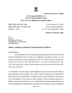 The Ministry of Corporate Affairs has introduced the Companies Compliance Facilitation Scheme, 2026 (CCFS-2026) through General Circular No. 01/2026 dated 24 February 2026. The purpose of this scheme is to reduce the financial burden created by the high additional fees applicable on delayed filing of Annual Returns and Financial Statements. The notification clearly records that companies have been struggling with the penalty of ₹100 per day without any upper limit, and therefore the Government has decided to allow a one-time opportunity to complete all pending filings at a highly discounted rate.