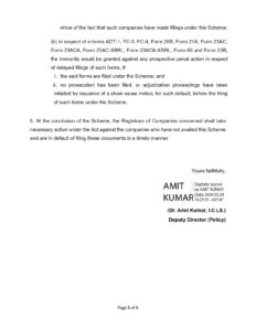 A key feature of the scheme is the immunity provision. When a company files its pending Annual Return or Financial Statement before the issuance of an adjudication notice, or within thirty days after such notice, no penalty will be levied under Section 92 or Section 137. For other forms such as ADT-1, FC-3, FC-4 and old Act forms, immunity is granted for delayed filing only when no prosecution or adjudication notice was issued prior to filing under the scheme. This protects companies from penal consequences when they regularise their filings within the scheme period.